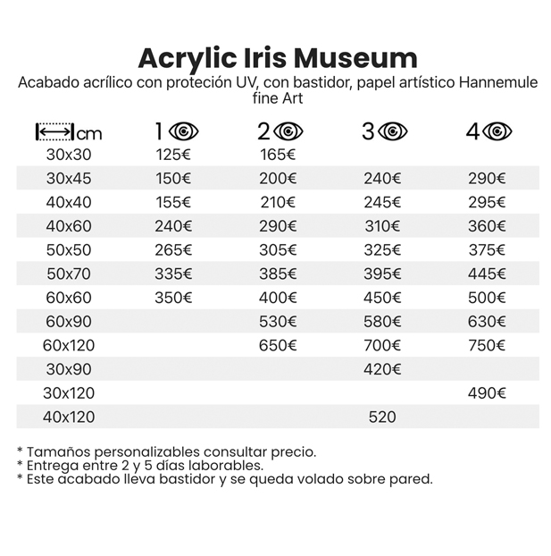 Acabado acrílico con proteción UV, con bastidor, papel artístico Hannemule fine Art