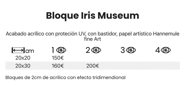 Acabado exclusivo diseñado por el equipo de Iris Colors, combina papeles artísticos Hannemule o ilford Galerie, en metallic, pearl o photo rag, con impresión en tintas pigmentadas, con un siliconado ultracristalino sobre Acrylico museo de 4mm y un bastidor trasero para dejar la foto sobre elevada, este acabado tiene una garantía de 100 años de durabilidad sobre los pigmentos.